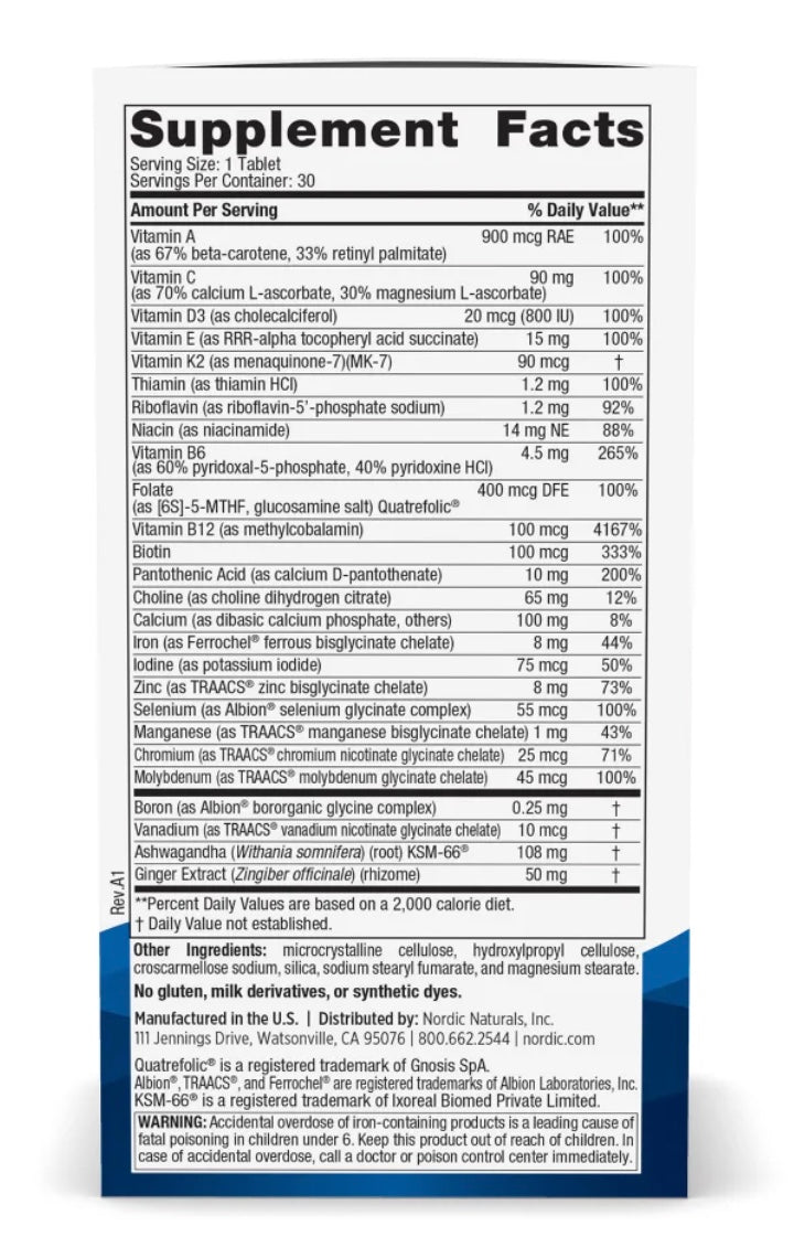 Women’s Multivitamin One Daily provides full-spectrum support for women’s foundational health and well-being with 20 essential vitamins and minerals in just one daily tablet.* It’s formulated with highly bioavailable vitamins and chelated minerals for easy absorption, and includes herbal support from ashwagandha and ginger, which have been shown to benefit women’s reproductive health and mood balance.*