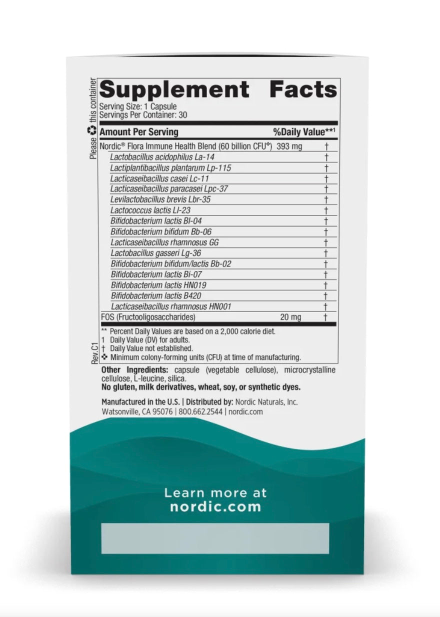 Nordic® Flora Probiotic Immune Health combines fifteen probiotic strains with 60 billion cultures to support respiratory wellness and a healthy immune response.* This formula also contains prebiotic FOS, providing a source of nutrition for the beneficial bacteria found within the gut.